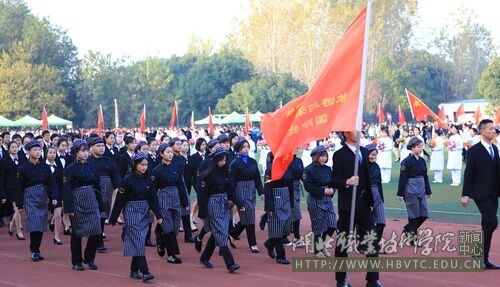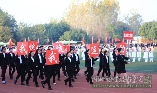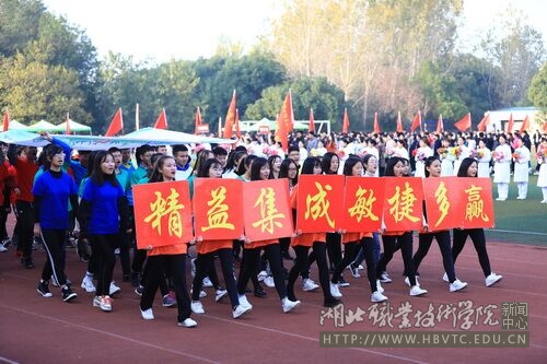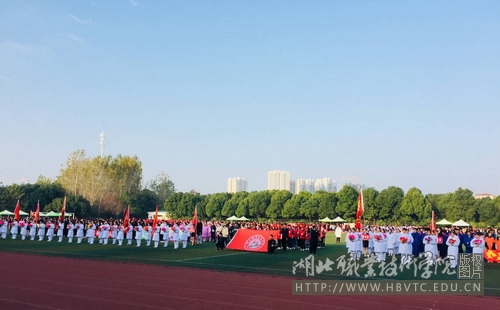 开幕式入场式上,走在最前列的是我校的国旗护卫队,这是一支由曾在部队服役过的大学生组成,国旗护卫队成员,曾经在军营写下峥嵘岁月,曾经走过金戈铁马,向着梦想,为了目标,汇聚在中华孝文化名城,汇聚在武汉城市圈副中心城市,汇聚在湖北职院,再次为国旗添彩,让青春增辉。会徽、鲜花队、旗林队伍,各代表队迈着整齐的步伐,依次入场。东区田径场,师生笑容写在脸上,花海映着朝阳。青春把岁月擦亮,运动将旋律奏响。师生用赤诚之心、协同之力,绘制湖北职院的美好篇章。