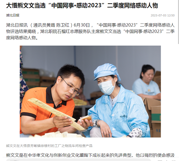 湖北日报讯(通讯员 黄璐 陈卫红 )6月30日,“中国网事·感动2023”二季度网络感动人物评选结果揭晓,湖北职业技术学院石榴红志愿服务队主席熊文文当选“中国网事·感动2023”二季度网络感动人物。