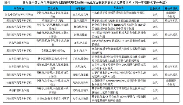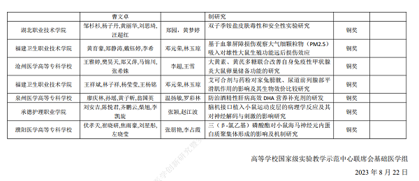 (本网讯 文雪 )8月19日至22日,由高等学校国家级实验教学示范中心联席会基础医学组、高等学校基础医学创新创业协同育人工作组主办,重庆医科大学、哈尔滨医科大学、上海交通大学医学院承办的“第九届全国大学生基础医学创新研究暨实验设计论坛高职高专组暨2023‘一带一路’国际大学生医学基础创新实验设计论坛”在重庆医科大学举行。今年我校两支学生团队参加决赛,比赛成绩取得新的突破,由文雪、李文敏指导的学生团队获得总决赛金奖,郑园、黄梦婷指导的学生团队获得铜奖。
